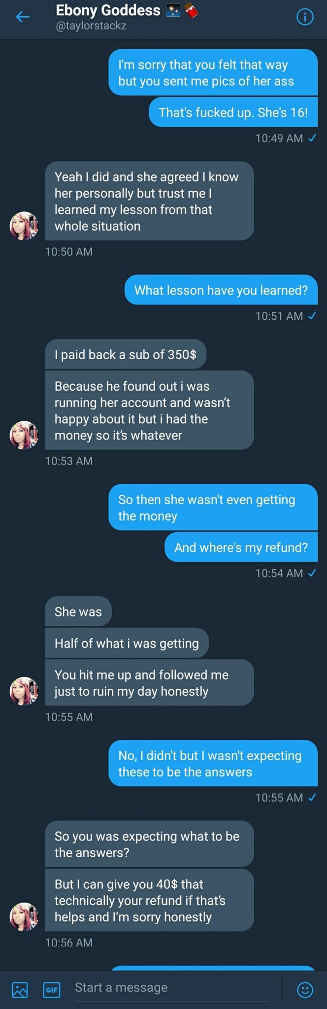 Exposing Findommes On Twitter The Findom Who Was Using A Minors Pictures Amp Created An Unauthorized Account To Scam Money Out Of Subs Is Back Formerly Known As Taylorstackz Ebonygawdess Goddesstaylor97 Yourebonydrug