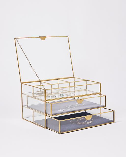 Gold Glass Blue Velvet Three Tier Jewellery Box Oliver Bonas