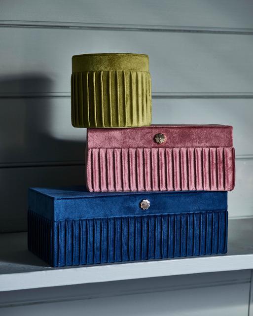 Oliver Bonas Rainbow Colours In Soft Brushed Velvet 1394696 Teal Blue Pleated Velvet Round Jewellery Box Medium 1394535 Khaki Green Pleated Velvet Rectangle Jewellery Box Small 1394511
